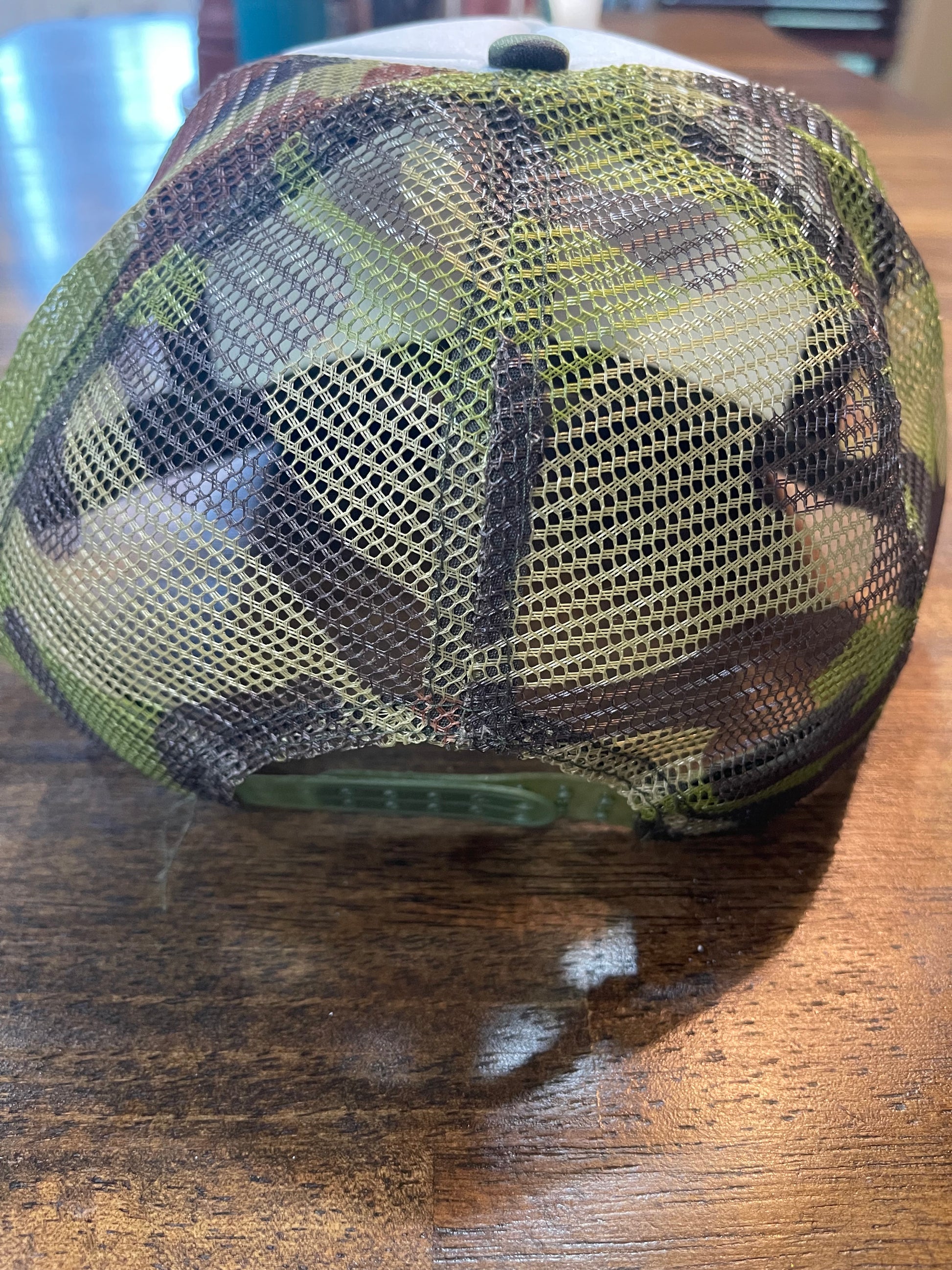 Camo trucker cap with Tini Time, black rose, leopard cross and star patches. SnapBack.